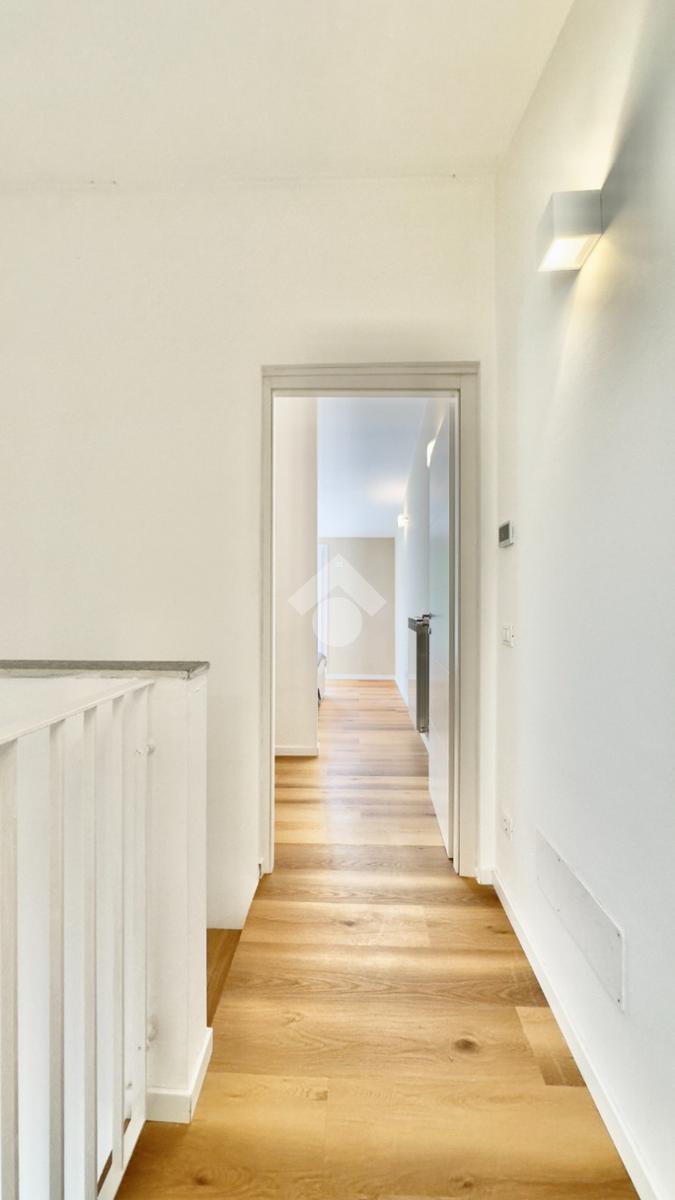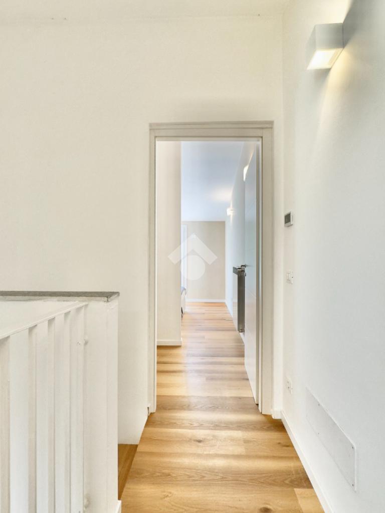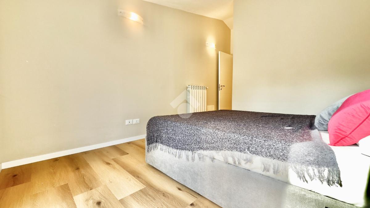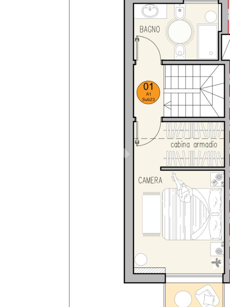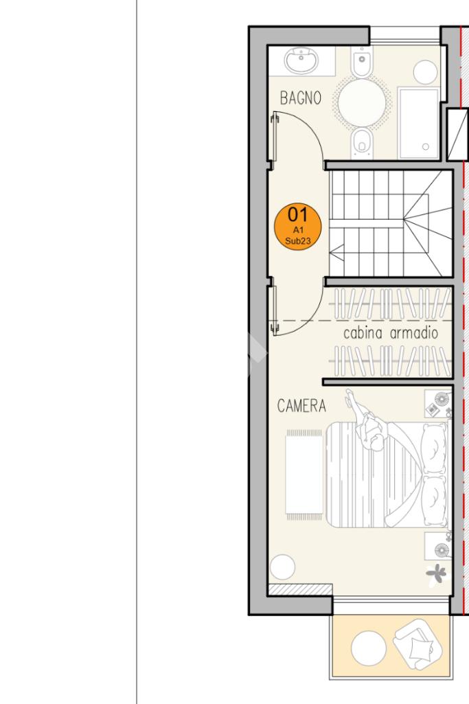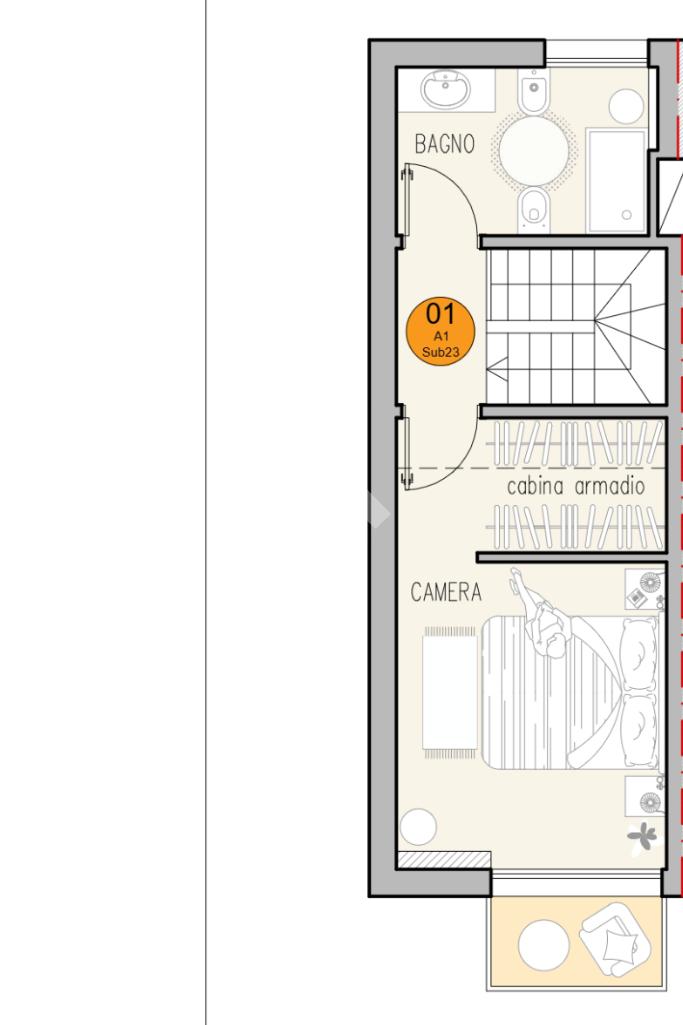 Una scala in legno conduce al piano primo, dove vi è una camera matrimoniale con cabina armadio, oltre un bagno finestrato completo di box doccia.