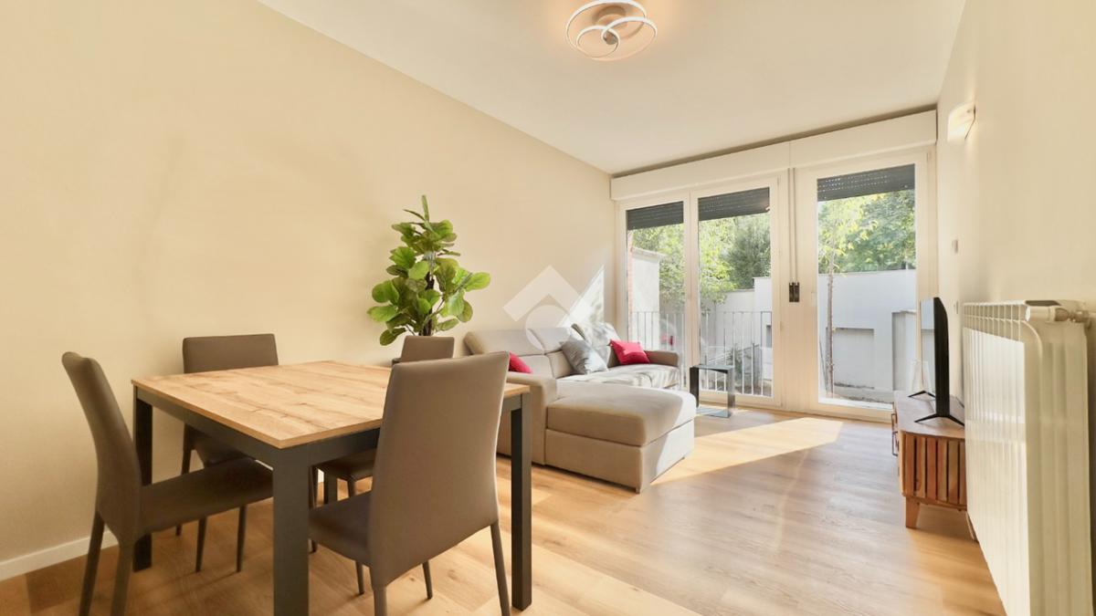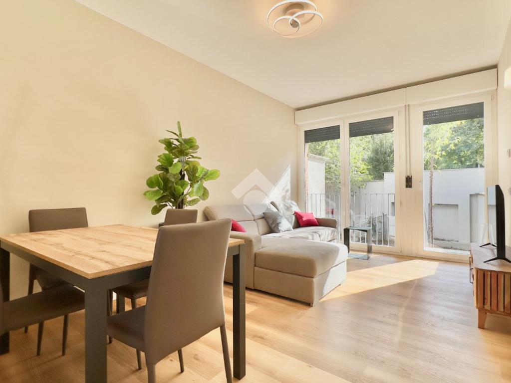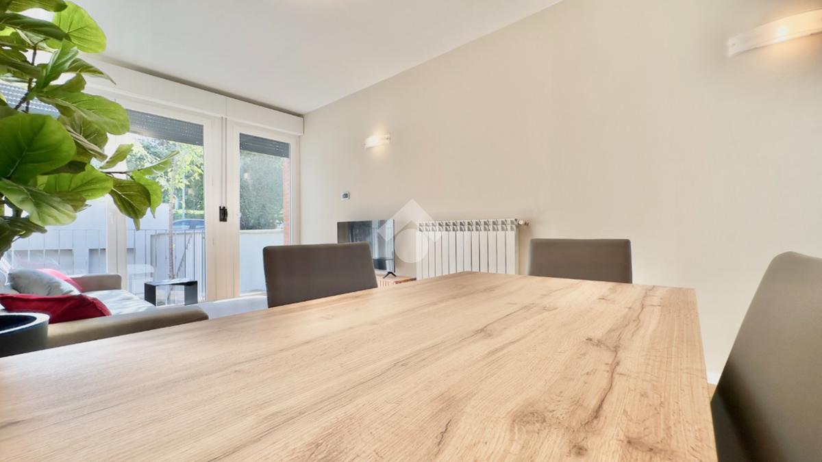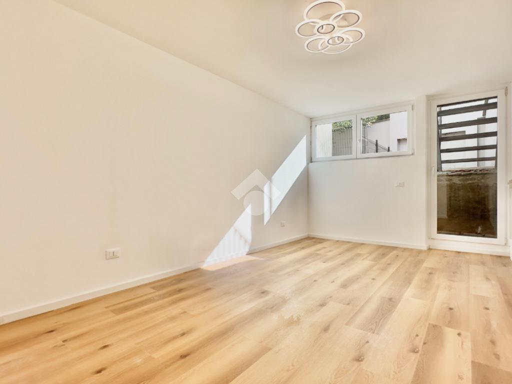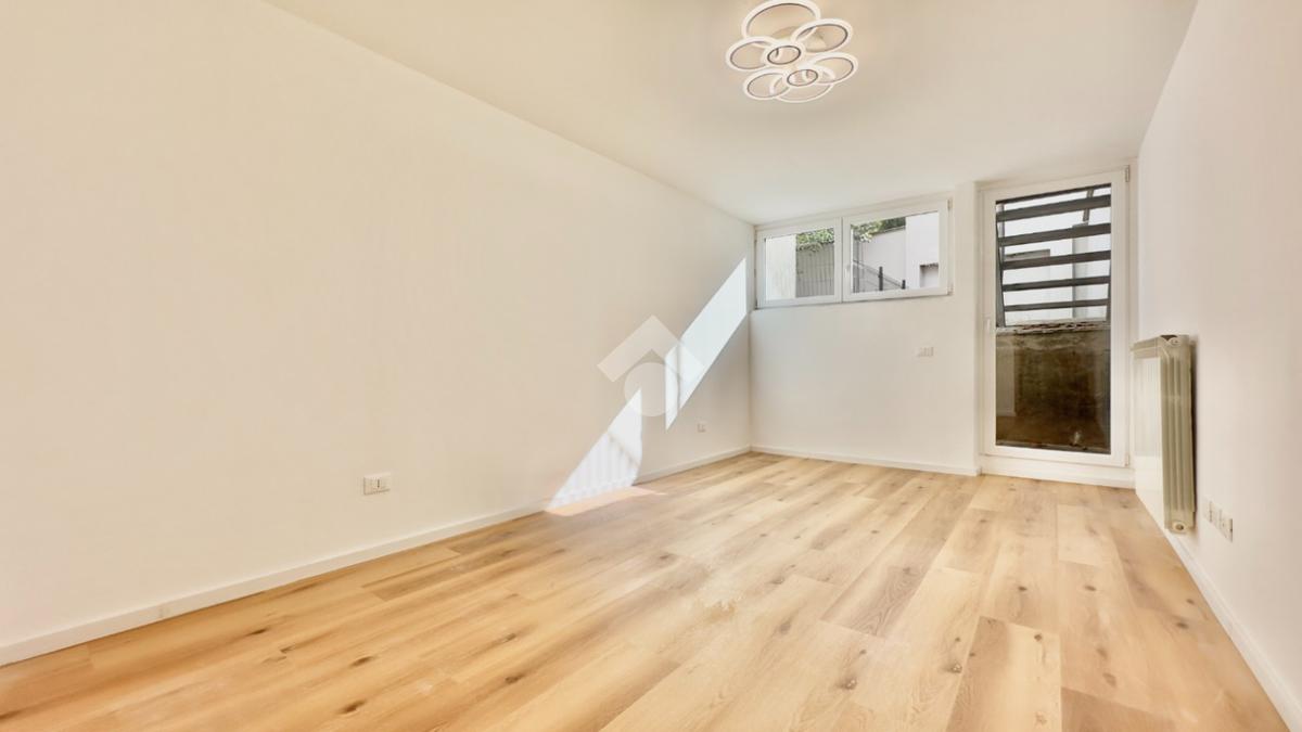 Il piano terra ospita una zona giorno ben organizzata, composta da un cucinotto con cucina di qualità italiana su misura e completamente attrezzata, e da un luminoso soggiorno che, grazie alle ampie finestre, si apre sul giardino di proprietà esclusiva.