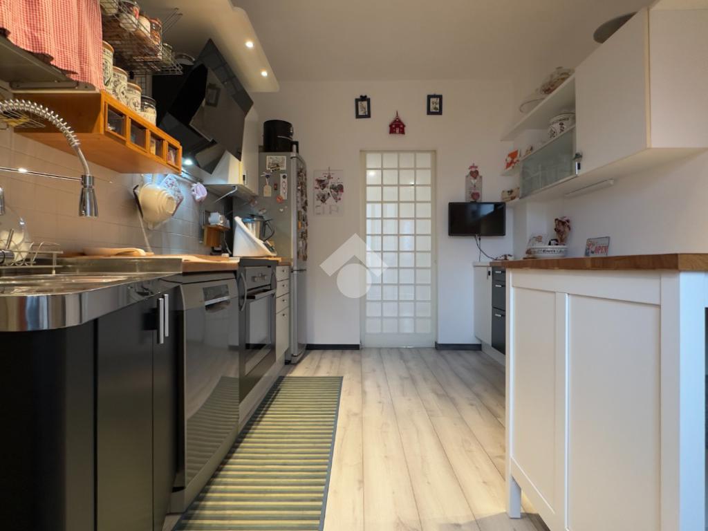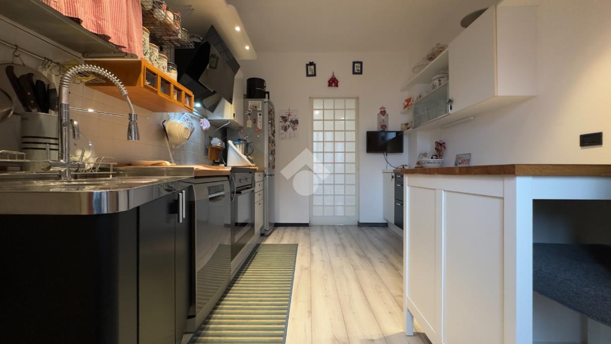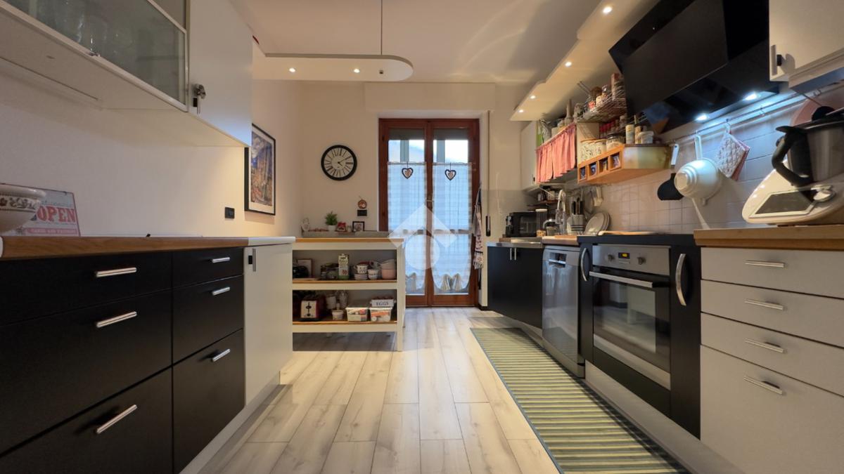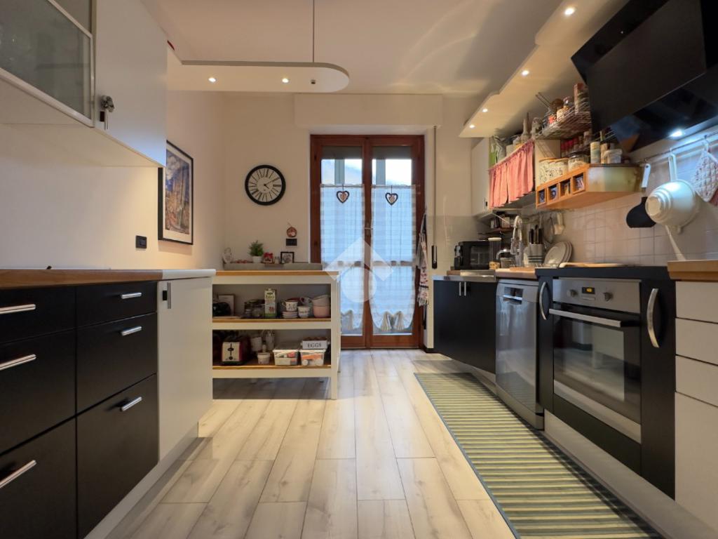 La cucina, realizzata su misura, è funzionale e ben organizzata, con accesso a un secondo balcone verandato che aggiunge praticità e ulteriore spazio sfruttabile durante tutto l’anno.