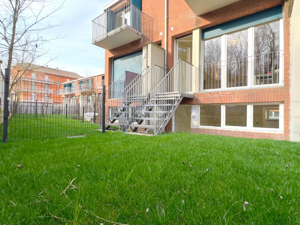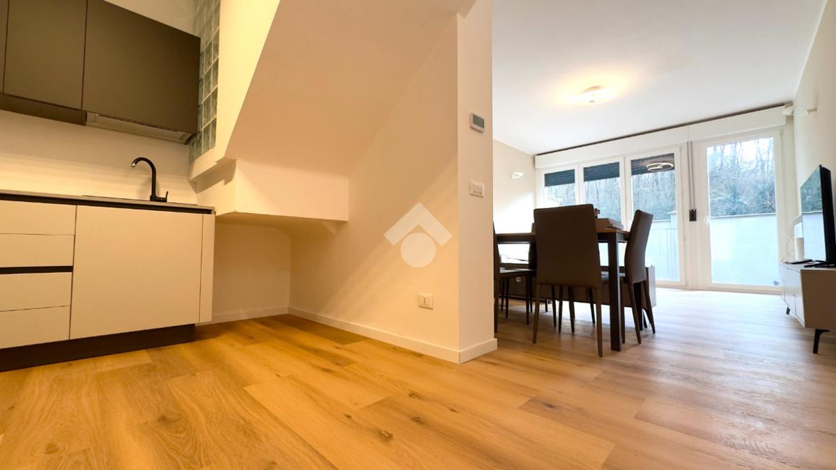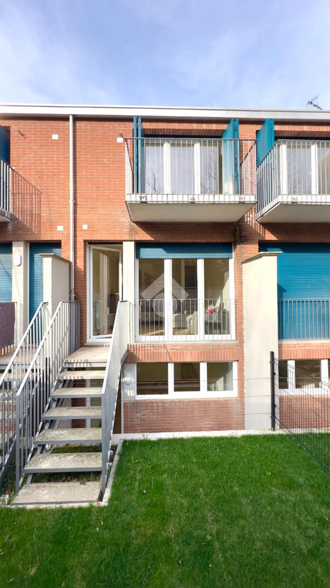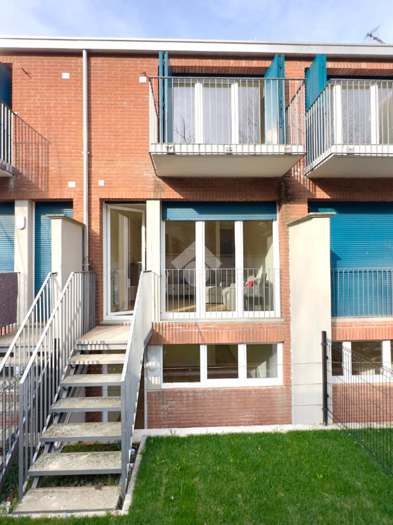 L' abitazione si apre sulla cucina su misura, con piano ad induzione, forno elettrico e lavastoviglie, mentre il soggiorno, luminoso grazie alle ampie superfici finestrate, si affaccia sul giardino recintato di proprietà, ideale per godere di uno spazio riservato e tranquillo.