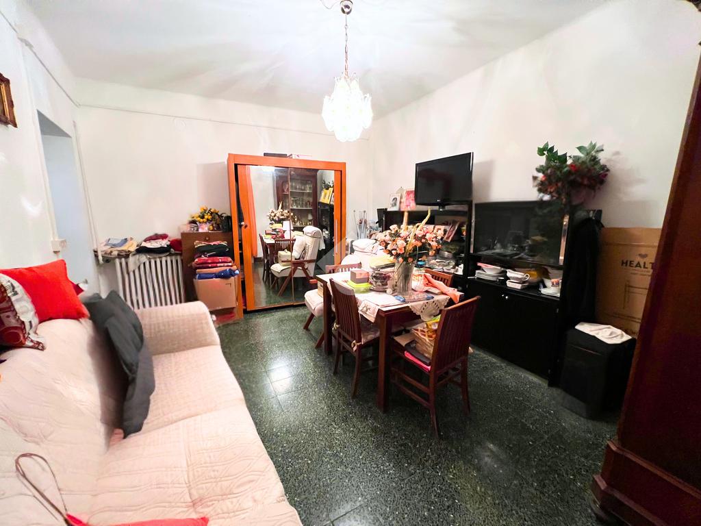 Il soggiorno, con affaccio diretto su via Roma, gode di una piacevole luminosità e di una vista vivace sul contesto urbano.